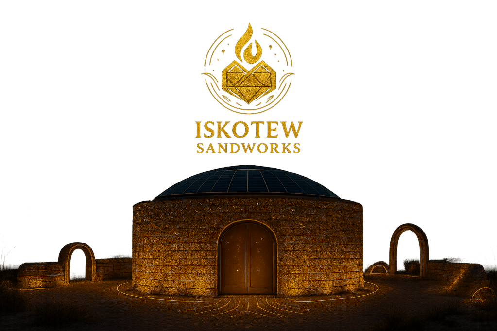 ISKOTEW SANDWORKS™ is a regenerative, circular economy system that transforms post-consumer glass into construction-grade sand for fire stations, shelters, ceremonial domes, and sovereign estate builds. Anchored in the Cree word iskotew (“fire”), it unites fire, earth, and sovereignty—turning waste into protective infrastructure and ledgered wealth.