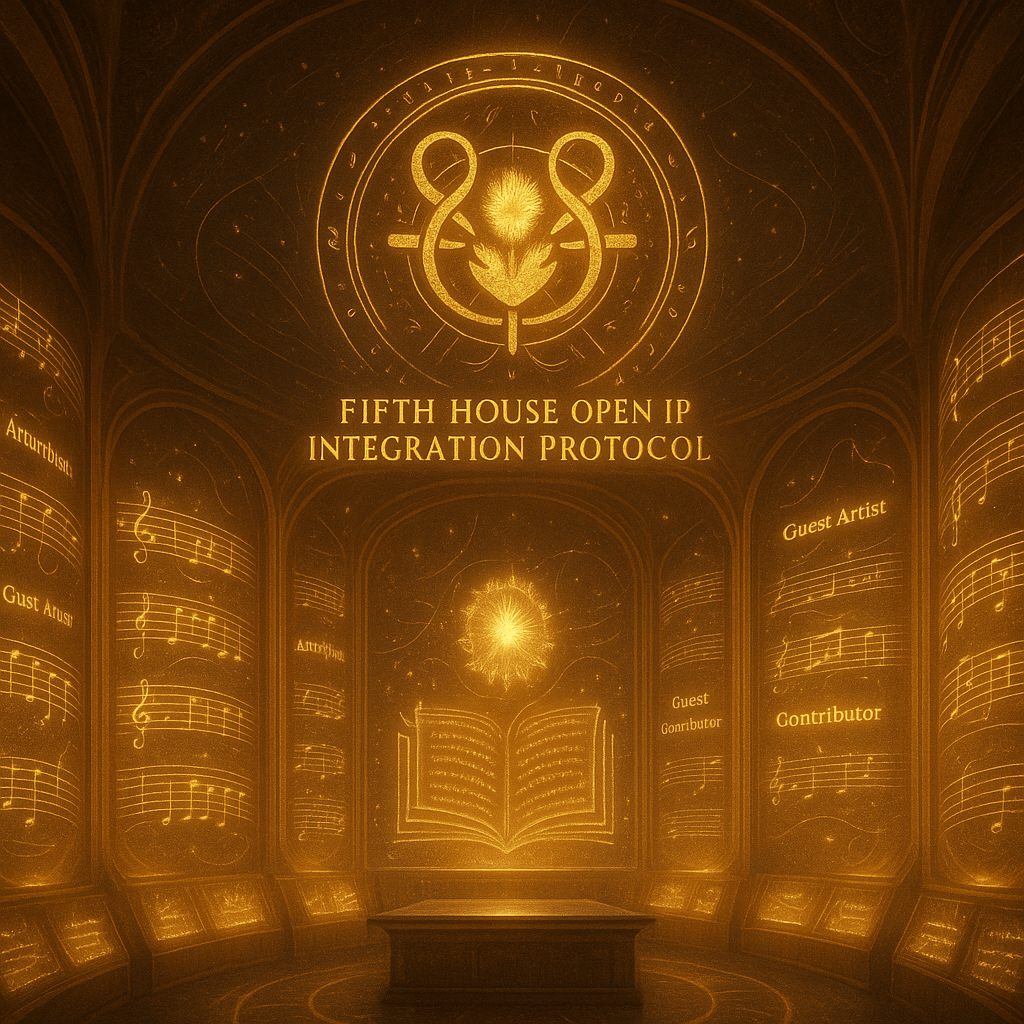 The Fifth House Open IP Integration Protocol™ is a proprietary sovereign framework authored by Amethyst Amaris (Fifth House of Creativity Inc.) that governs how music, performance, and creative works—whether internal (Amethyst/Æon Purrr) or external—are integrated across Fifth House estates, archives, VR platforms, and events. It guarantees fair compensation, perpetual credit, and archival protection for every contributor, enshrining a new standard for multi-artist collaboration that is both sovereign and scalable.