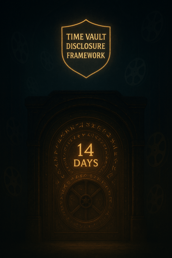 The Time Vault Disclosure Framework™ governs how cinematic estate systems are documented, stored, and released. Built on a 14-day cloaking cycle, it protects high-value acquisitions while creating suspenseful narrative arcs and monetizable IP bundles.