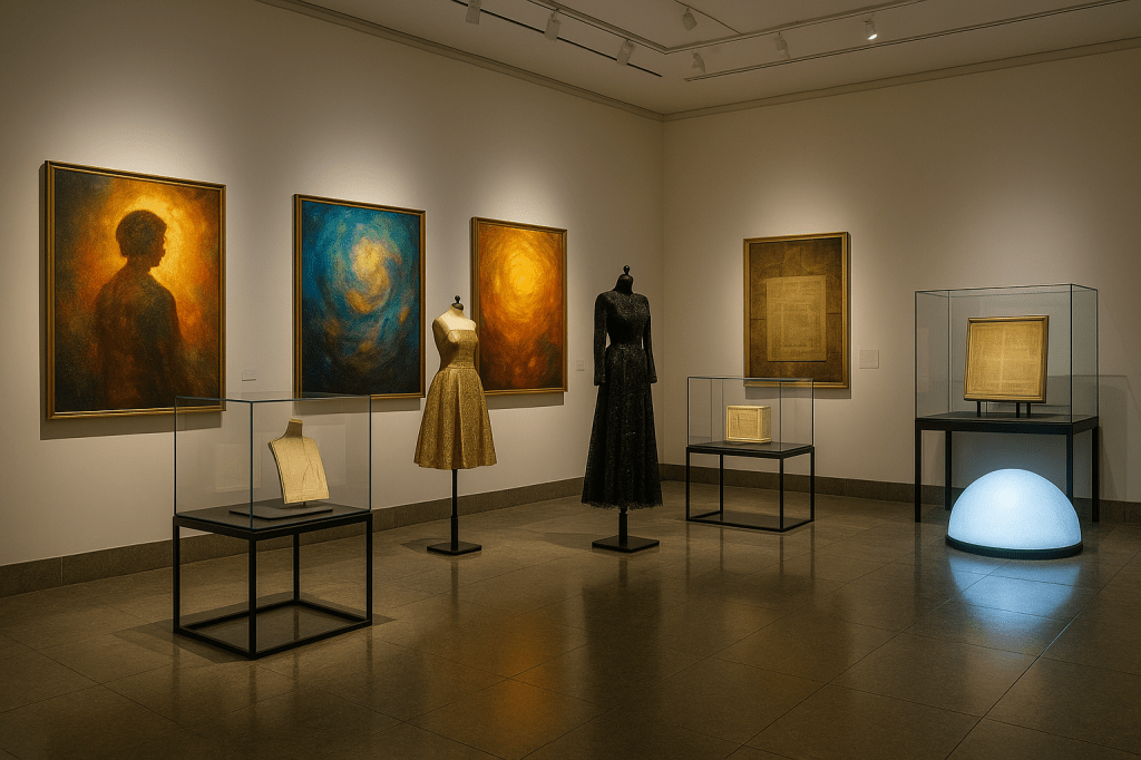 Fully ledgered valuation across fine art, fashion, sonic, VR, and ancestral collections.