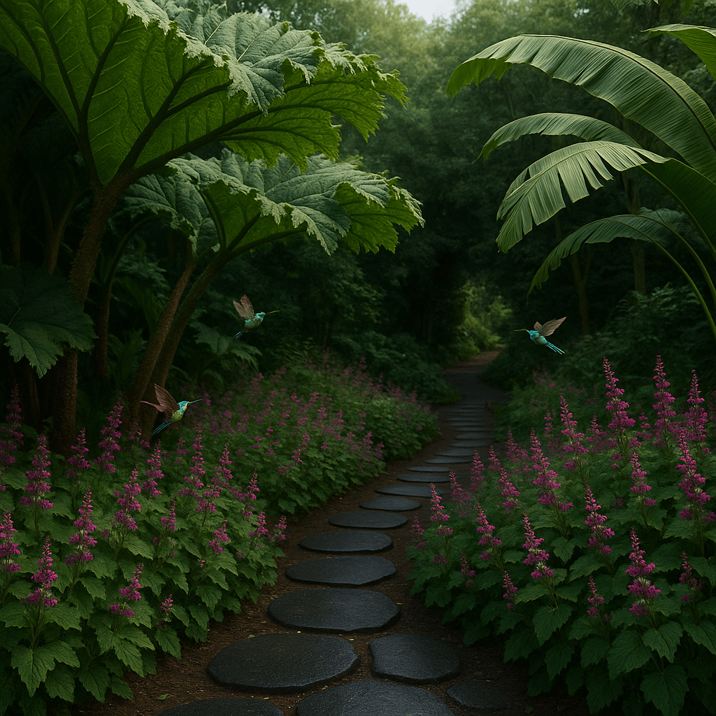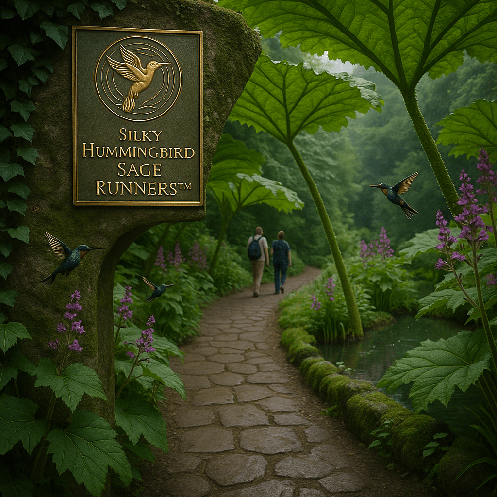 Silky Hummingbird Sage Runners™ is a sovereign ecological and cinematic corridor where sanctuary meets spectacle. Designed with monumental gunnera canopies, hummingbird sage carpets, silky medicine plants, ponds, fungal medicine nodes, and ceremonial hedge mazes, it functions as refuge, classroom, and film set. Every element multiplies ecological wealth, cinematic possibility, and ancestral presence.