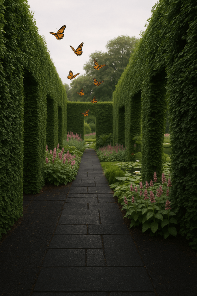 - Hedge Maze Corridor: labyrinth of hornbeam/cedar/yew revealing cinematic vignettes.