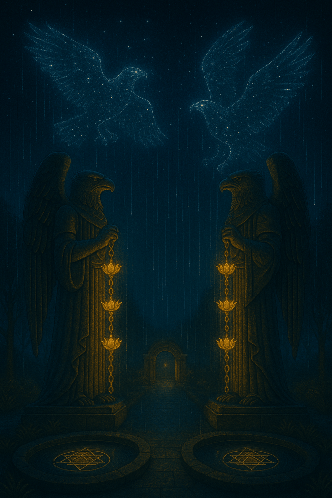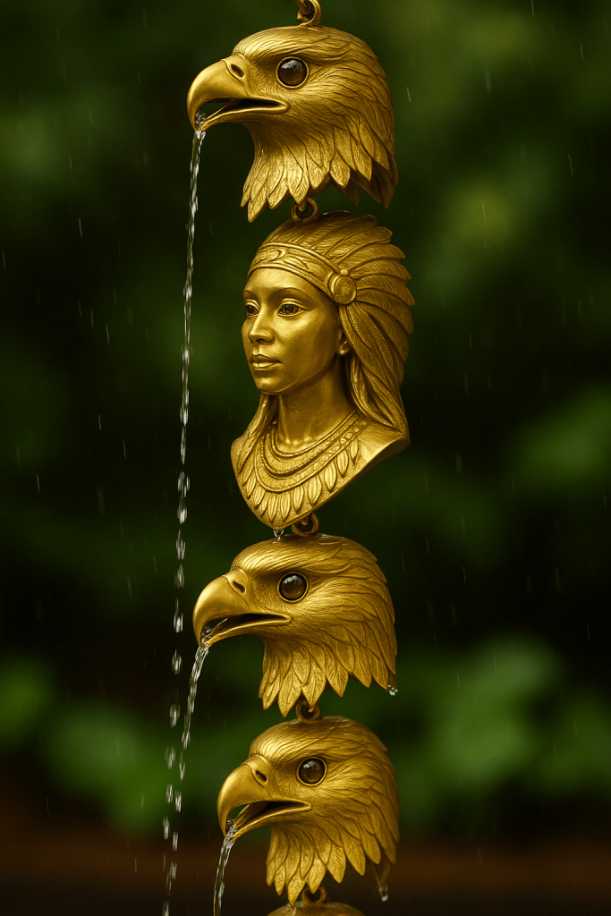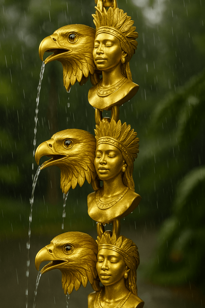 The Eagle Clan Rain Guardians™ are ceremonial rain chains that merge functional water infrastructure with sovereign artistry. Forged in gold and gemstones, each installation embodies ancestral presence, ecological renewal, and sonic ceremony. They transform rainfall into living song, where eagles act as messengers of the sky and grandmother ancestors channel memory, guidance, and protection.